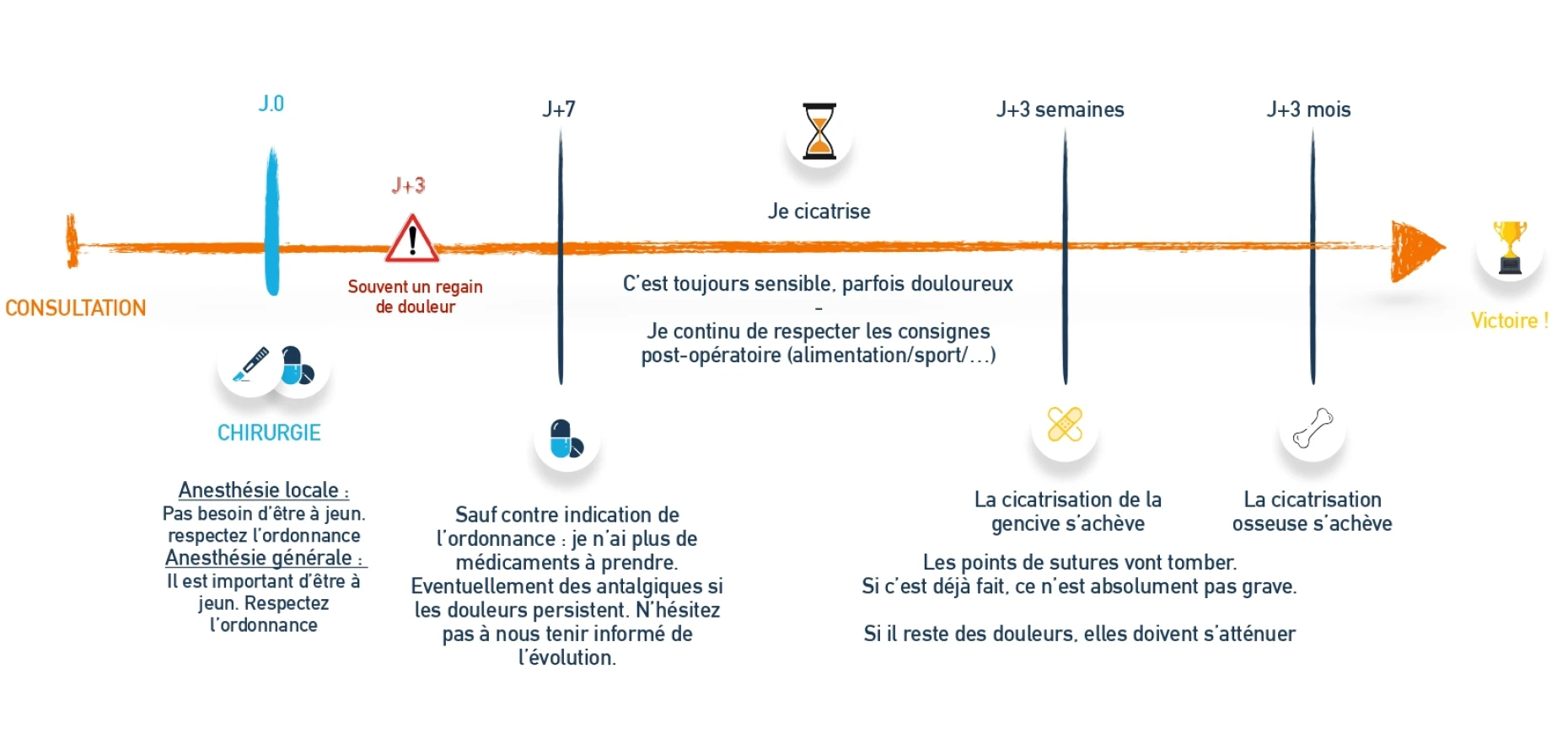 La cicatrisation osseuse est finalisée. La zone opérée ne présente plus de douleur ou de gêne. C’est une étape clé dans la réussite de votre traitement. Si vous avez des questions ou des inquiétudes, prenez contact avec votre praticien. Félicitations, vous êtes à présent complètement rétabli !